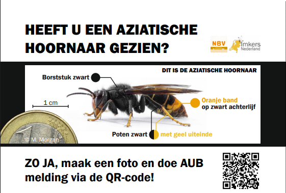 Op de site van de NBV is meer informatie te vinden: https://www.bijenhouders.nl/themas/aziatische-hoornaar/